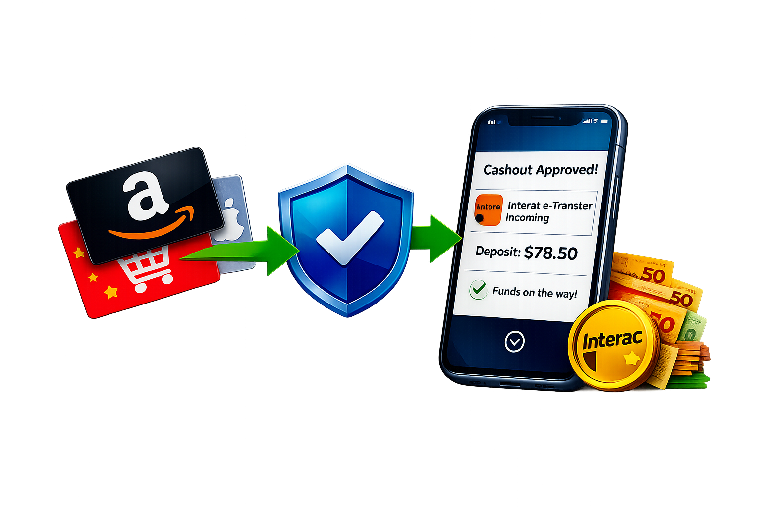 Cash out gift cards in Canada — fast Interac payouts — Interac e-Transfer in as little as 24 hours after approval.